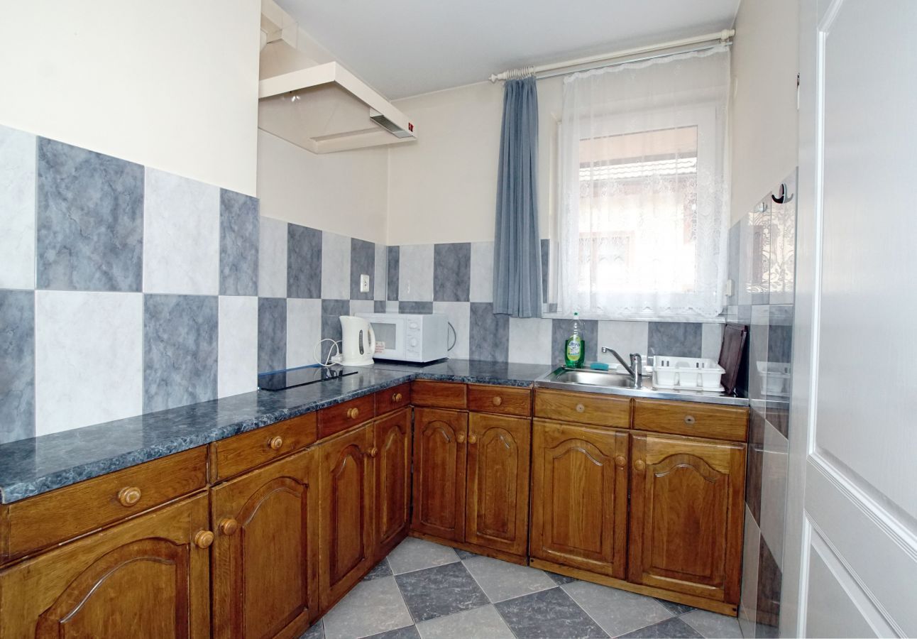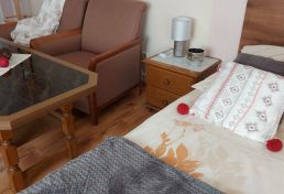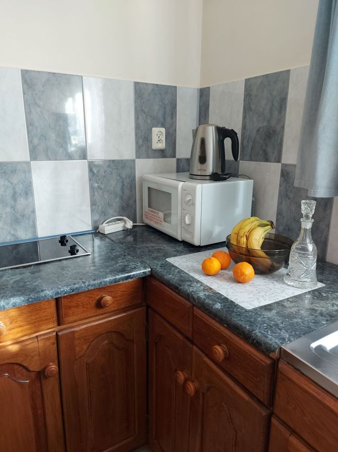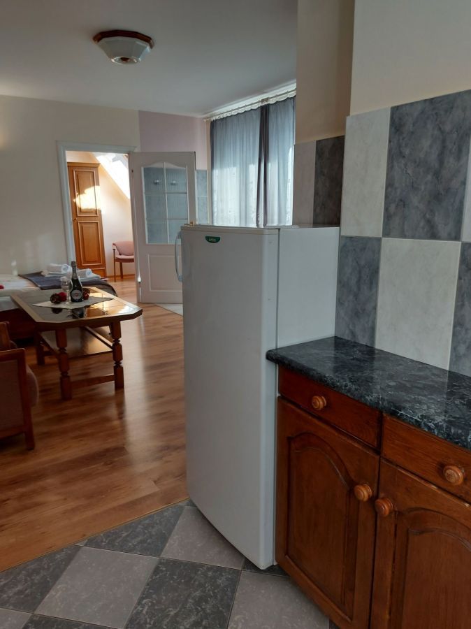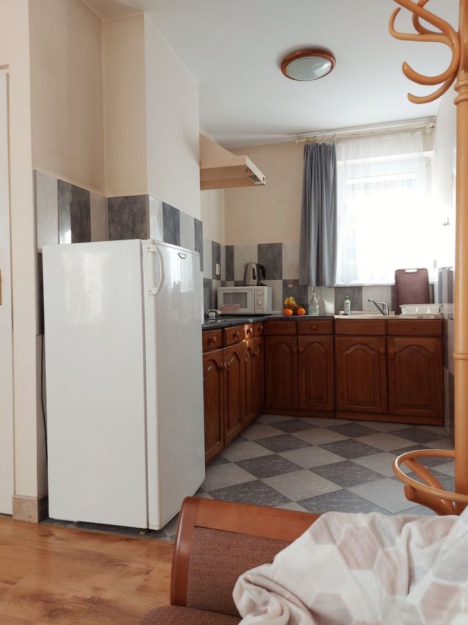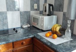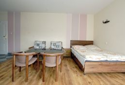 | Wyposażenie | aneks kuchenny z lodówką, kuchenką mikrofalową, zlewozmywak, czajnik bezprzewodowy, ekspres do kawy, kuchenka dwupalnikowa elektryczna, zestaw naczyń, łazienka z kabiną prysznicową, ubikacją i umywalką (gorąca woda całą dobę) + ręczniki, telewizor, dostęp do internetu WiFI. |