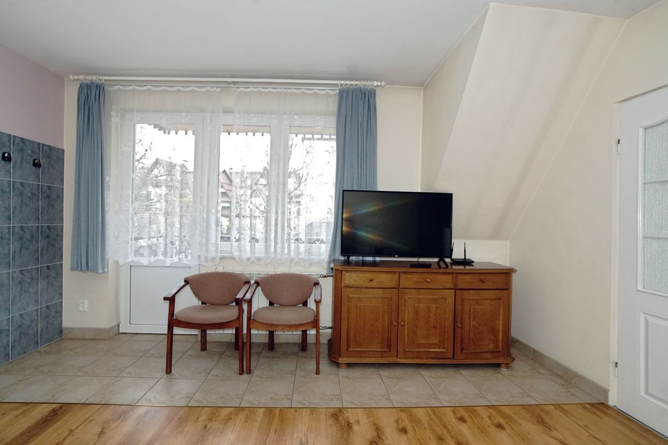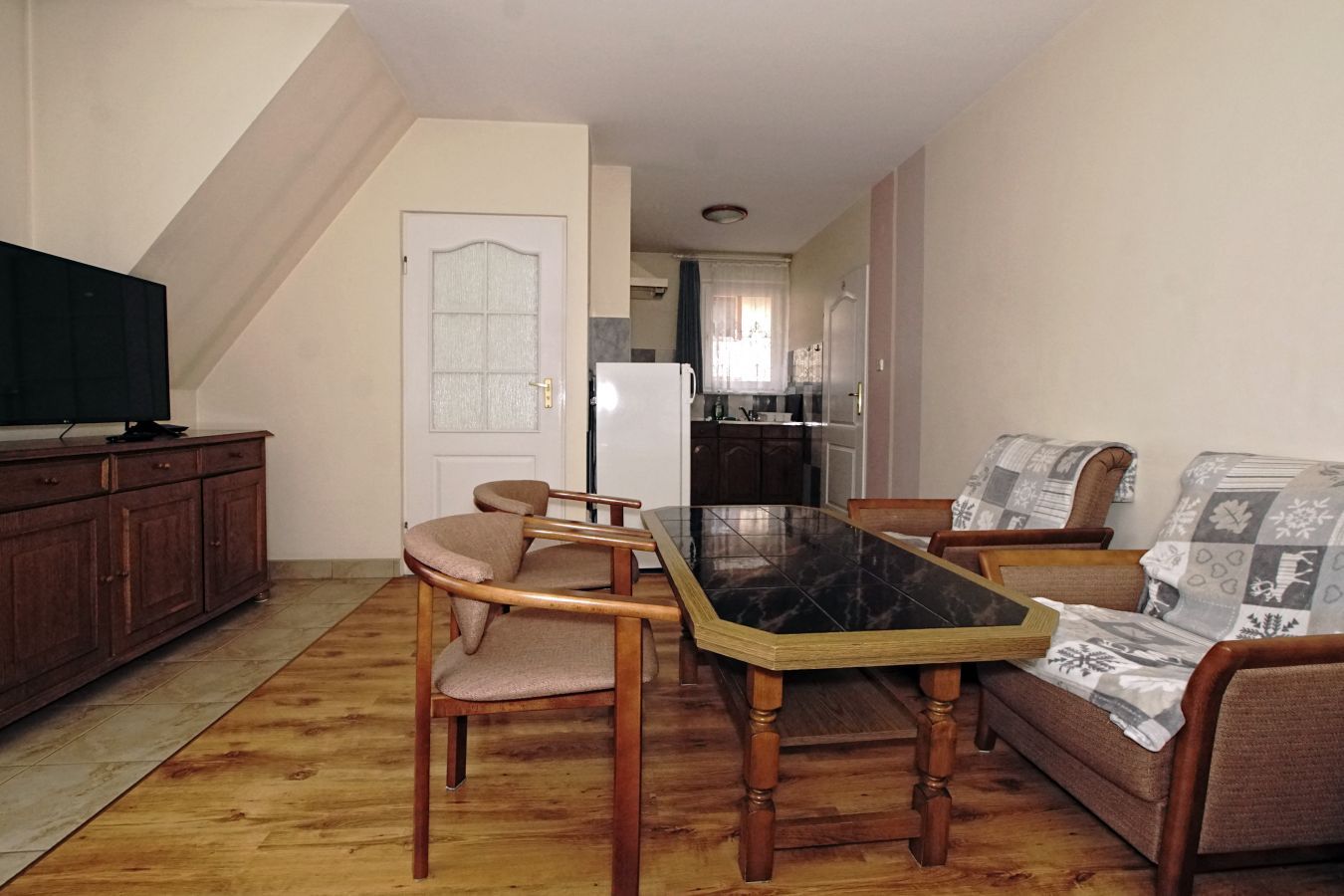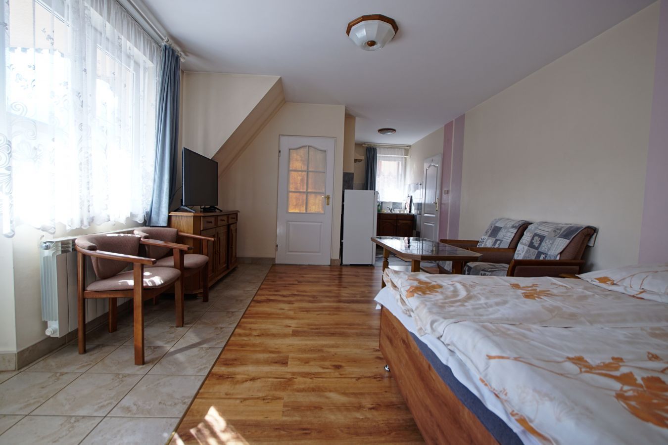 | Wyposażenie | aneks kuchenny z lodówką, kuchenką mikrofalową, zlewozmywak, czajnik bezprzewodowy, ekspres do kawy, kuchenka dwupalnikowa elektryczna, zestaw naczyń, łazienka z kabiną prysznicową, ubikacją i umywalką (gorąca woda całą dobę) + ręczniki, telewizor, dostęp do internetu WiFI. |