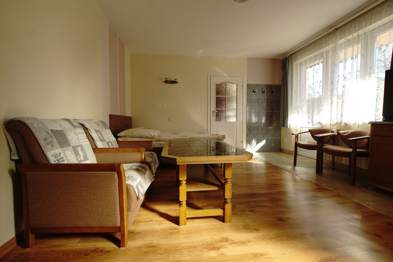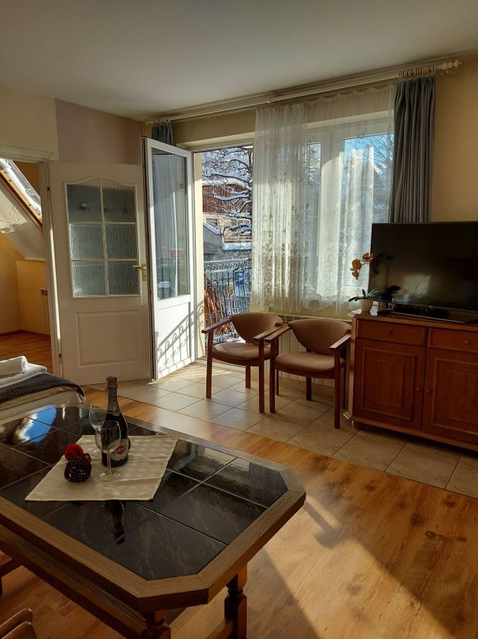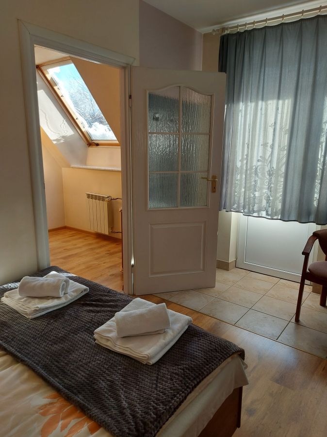 Składa się z części dziennej (łoże małżeńskie z materacem lateksowym), do której przylega z jednej strony część sypialna - 2 łożka jednoosobowe (możliwość zsunięcia), a z drugiej aneks kuchenny i łazienka. Apartament posiada balkon z widokiem na Giewont.