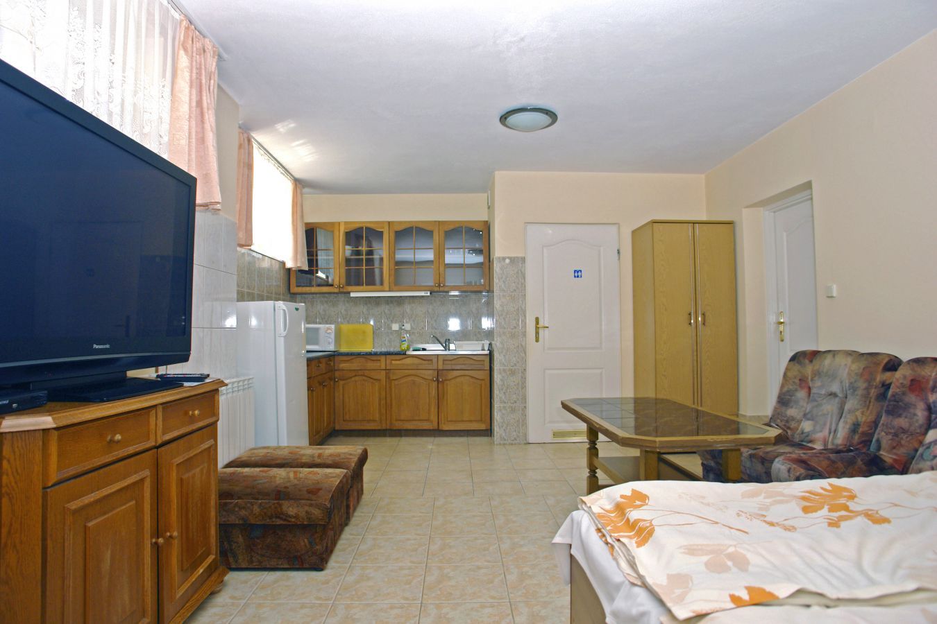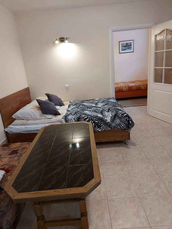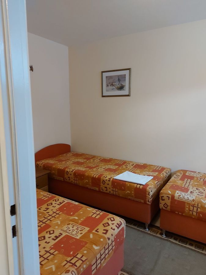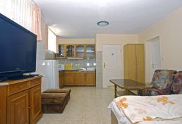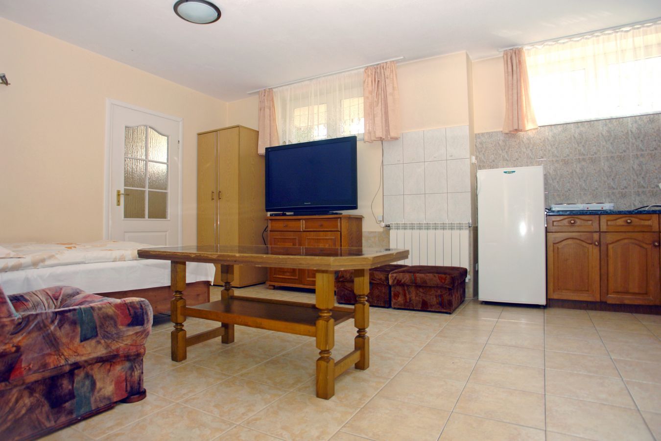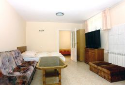 Apartament składa się z części dziennej z łożem małżeńskim (materac lateksowy ), do której przylega z jednej strony część sypialna ( 3 łóżka jedoosobowe), a z drugiej aneks kuchenny i łazienka . Nie posiada balkonu gdyż jest położony w niskim parterze (suteryna). Standard jest ten sam co w pozostałych apartamentach, ale ze względu na położenie jest tańszy.