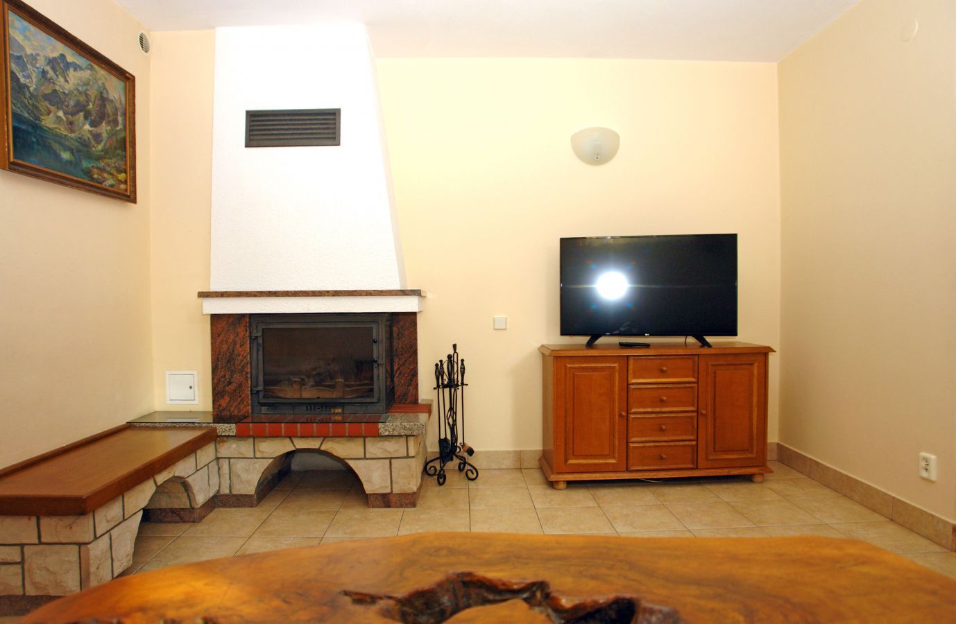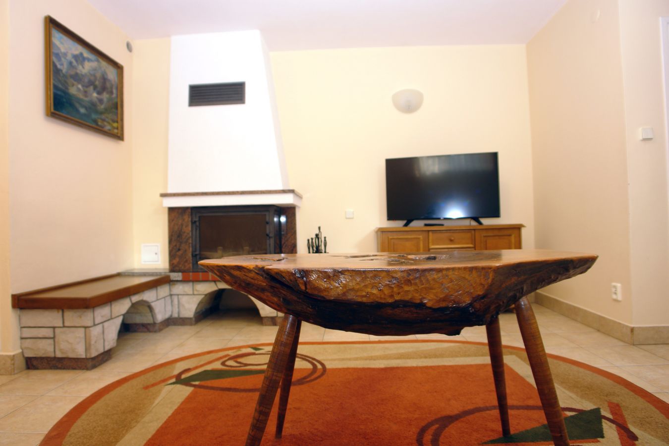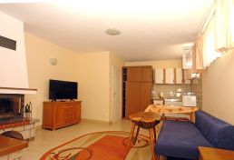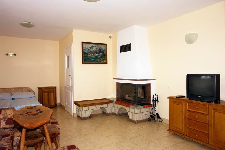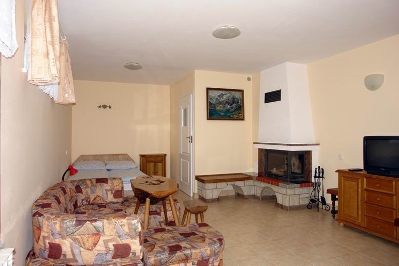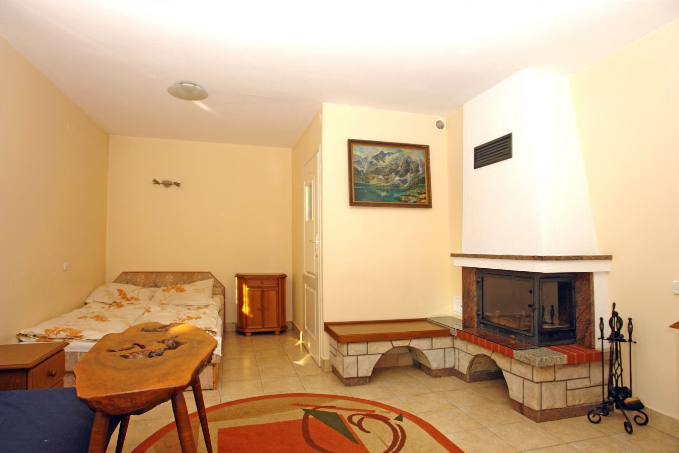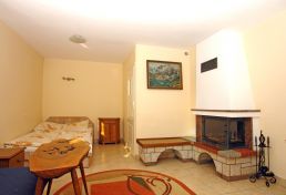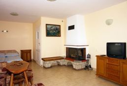 Apartament 1-pokojowy z kominkiem o powierzchni 28m2 posiada łóżko małżeńskie oraz sofę.