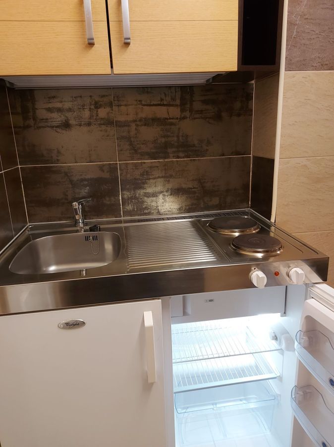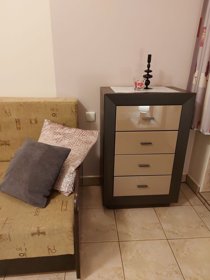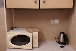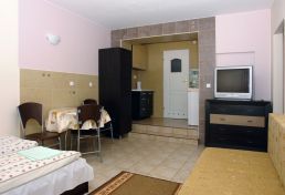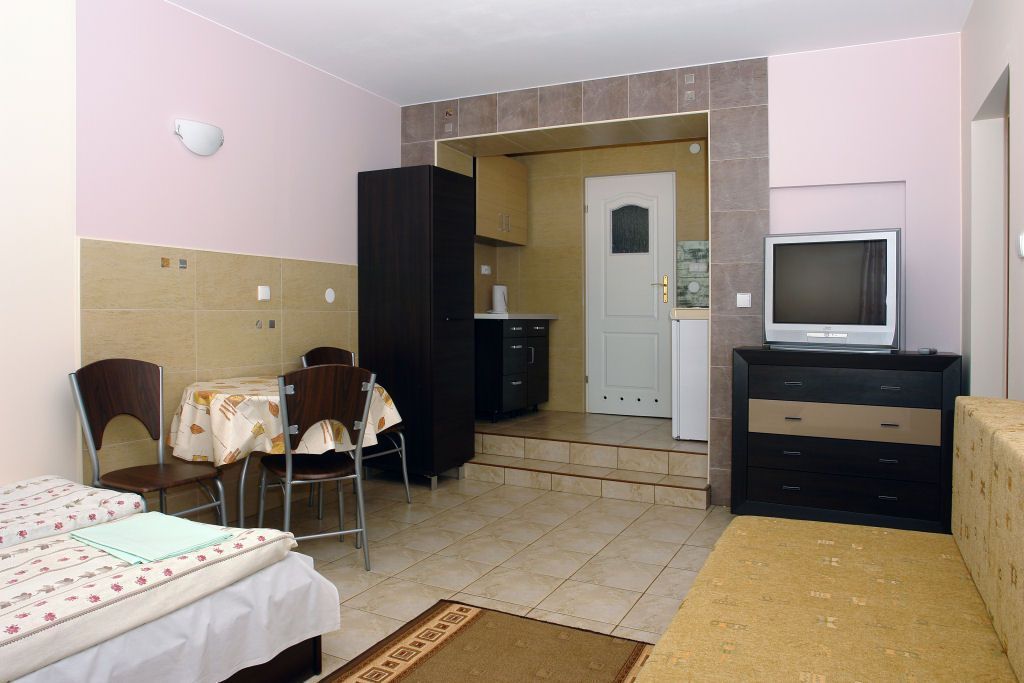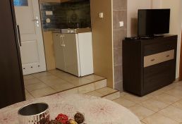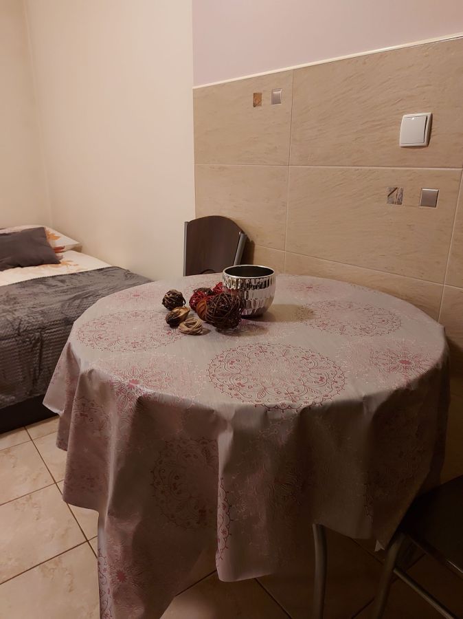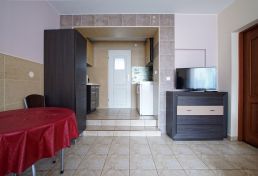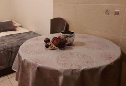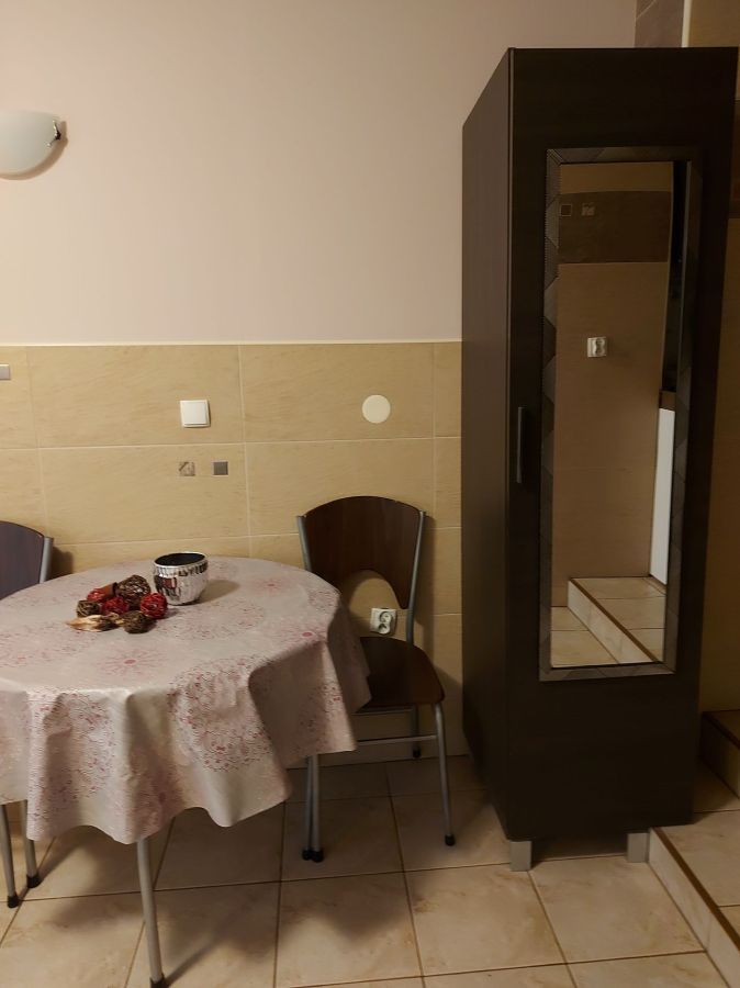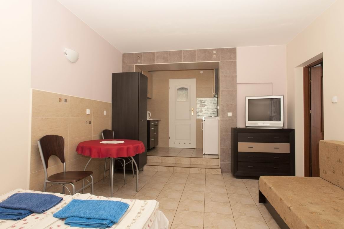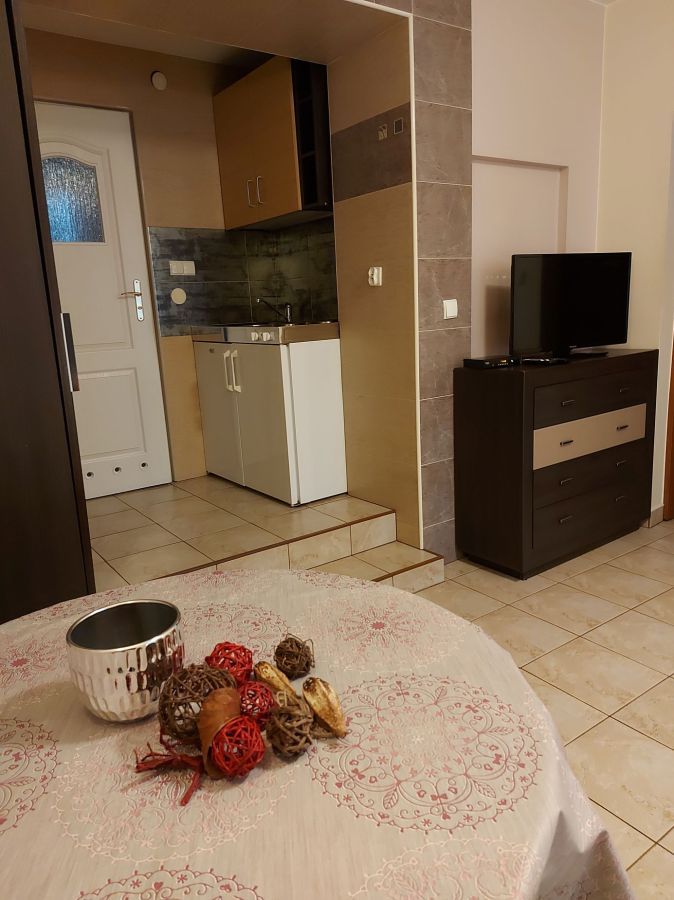 | Wyposażenie | aneks kuchenny z lodówką, kuchenką mikrofalową, zlewozmywak, czajnik bezprzewodowy, ekspres do kawy, kuchenka dwupalnikowa elektryczna, zestaw naczyń, łazienka z kabiną prysznicową, ubikacją i umywalką (gorąca woda całą dobę) + ręczniki, telewizor, dostęp do internetu WiFI. |